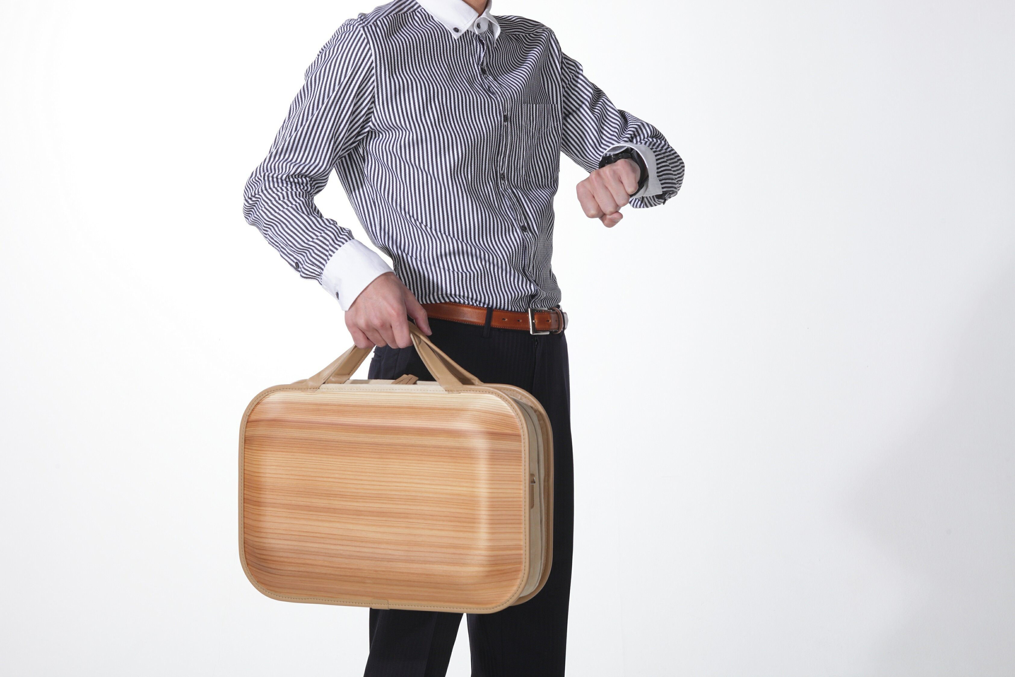 何度も塗り重ねては拭き取りを繰り返した塗装と天然皮革とのコンビネーションは、味わいのある木の表情を生み出し、持つ人のライフスタイルを演出。