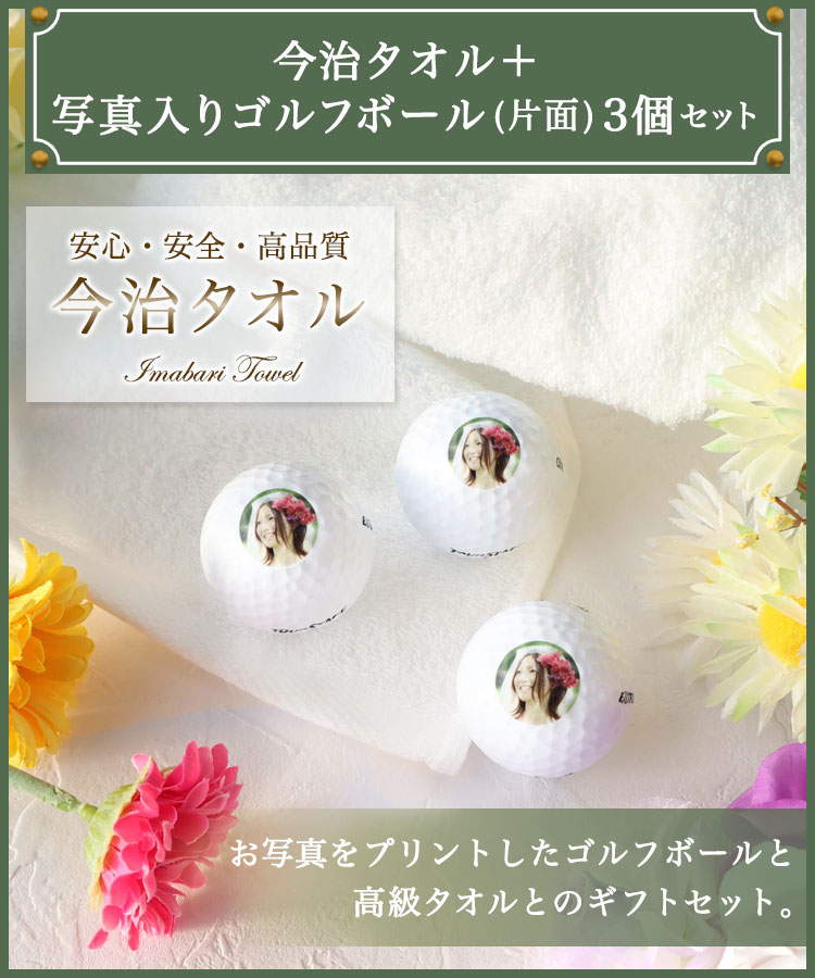 ギフト2点セット/ 今治タオル+【ロゴ・写真入り(片面印刷)】ゴルフボール 3個セット /人気の今治タオルと写真入りのゴルフボールとのセット商品/ゴルフボールは片面印刷です/写真だけでもOK、写真の下に名前を入れてもOK/今治タオルはフェイスタオル/メッセージカード可